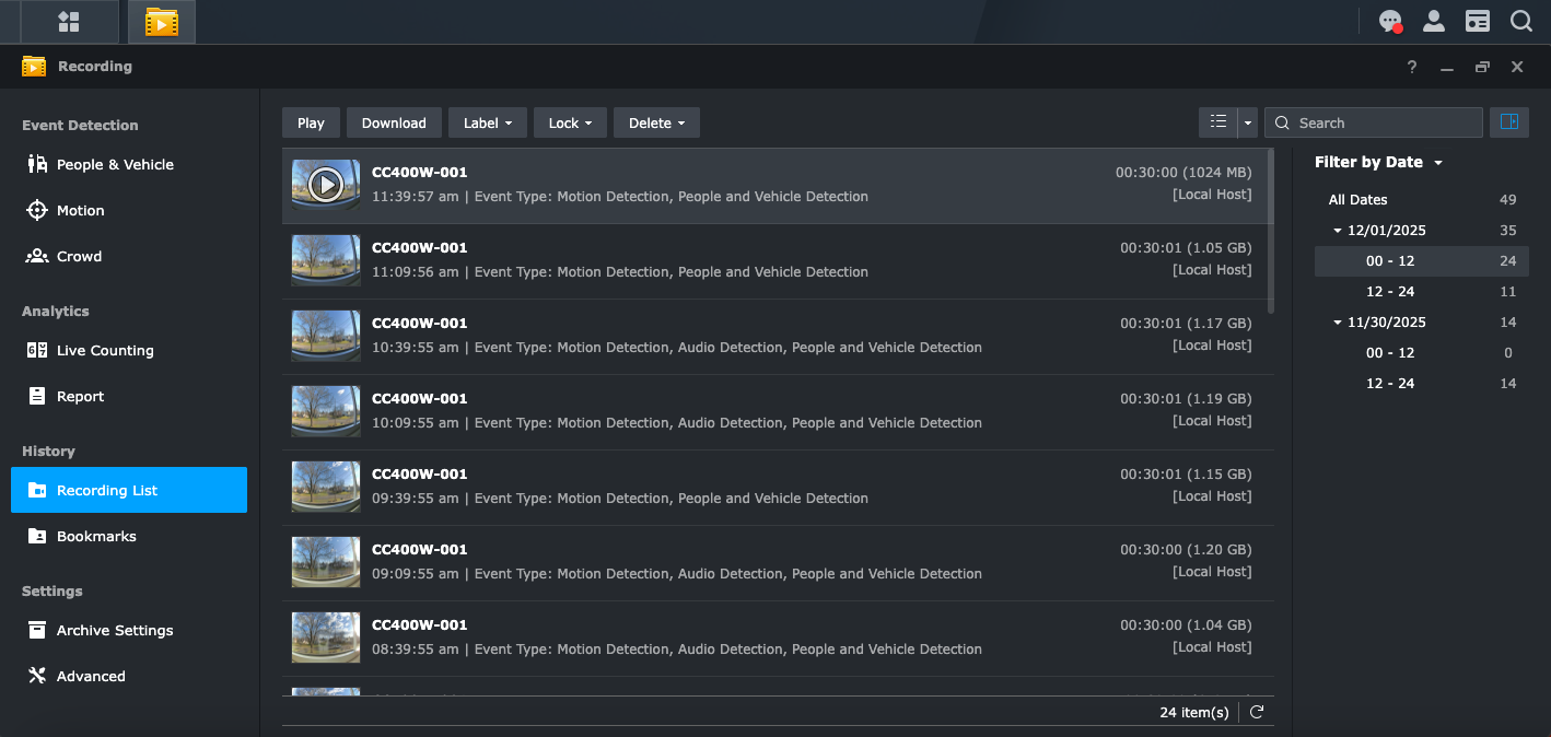 The recording list provides an excellent summary of all of the captured events, and also provides summary information for when the activity was captured by date and time of day.